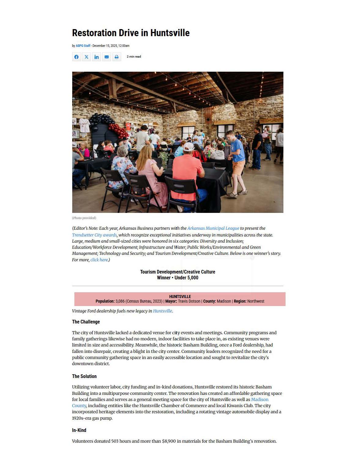 The City of Huntsville has been recognized as a 2025 Trendsetter City by Arkansas Business in the Tourism Development/Creative Culture category for the revitalization of the historic Basham Building.