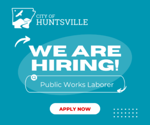 City of Huntsville is accepting applications for a Public Works Laborer. If interested, please submit an application or resume to Mayor Dotson at [email protected] or in person at Huntsville City Hall.